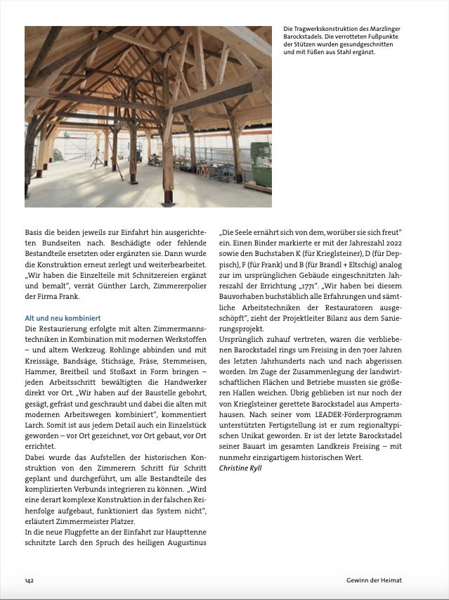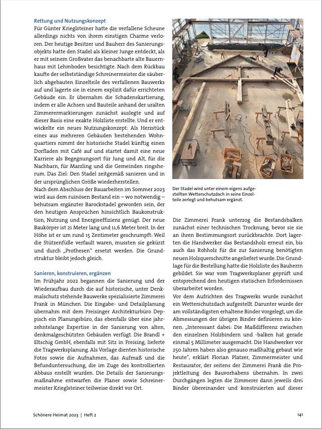 Der Umzug schenkte ihm das Leben, und er kostete die Eintragung in die Denkmalliste: In Marzling wird derzeit ein Barockstadel wieder aufgebaut. Der ursprünglich im nahe gelegenen Ampertshausen beheimatete Baukörper von 1771 ist der letzte datierte Barockstadel seiner Bauart im gesamten Landkreis Freising. Entstanden ist er in der Hochblüte der Zimmermannskunst. Deren Merkmale sind heute noch zu erkennen: barocke Überblattungen, abgesetzte Abfasungen, Schnitzereien und bemalte Details. Doch als er gut 250 Jahre nach seiner Errichtung unter Aufsicht des Bayerischen Landesamts für Denkmalpflege abgebaut und durch ein Aufmaß des Würzburger Planungsbüros ALS Ingenieure GmbH & Co. KG sowie von einem Kunsthistoriker fotografisch dokumentiert wurde, war von der einstigen Pracht des Ampertshausener Stadels nicht mehr viel übrig.