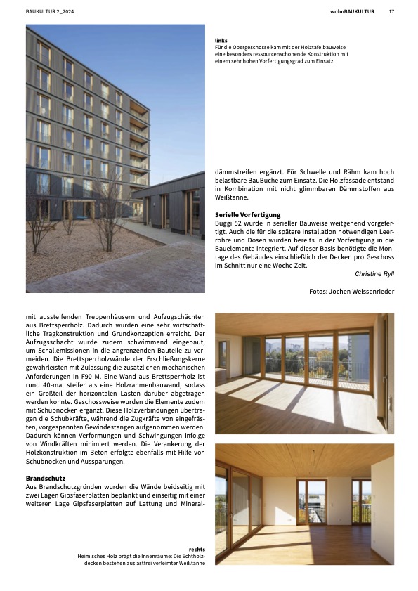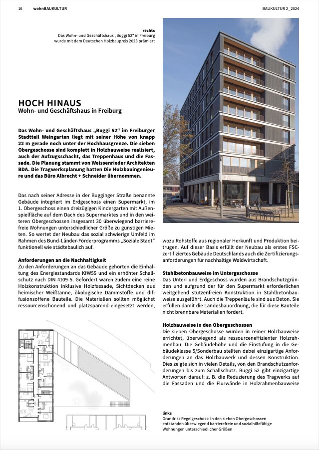 Das Wohn- und Geschäftshaus „Buggi 52“ im Freiburger Stadtteil Weingarten liegt mit seiner Höhe von knapp 22 m gerade noch unter der Hochhausgrenze. Die sieben Obergeschosse sind komplett in Holzbauweise realisiert, auch der Aufzugsschacht, das Treppenhaus und die Fassade. Die Planung stammt von Weissenrieder Architekten BDA. Die Tragwerksplanung hatten Die Holzbauingenieure und das Büro Albrecht + Schneider übernommen.